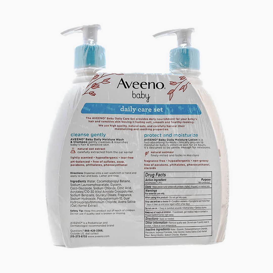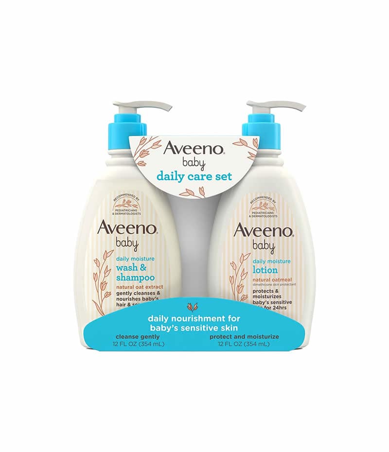 - Aveeno Baby Daily Care Set features a gentle wash/shampoo and a moisturizing lotion specially designed for baby’s delicate skin.